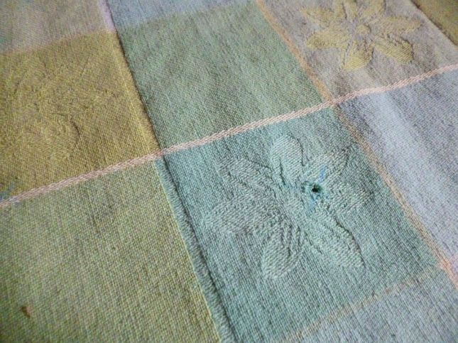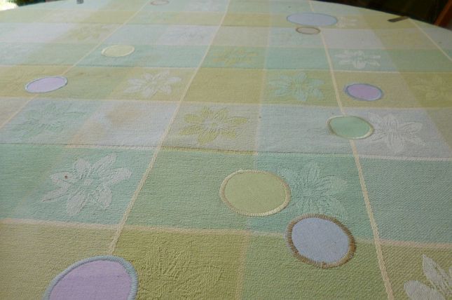 2001-ben vettem talán Marennes-ben, de mindenképpen valahol a franszia atlanti tengerparton egy szép zsakárdpamut abroszt, amit azóta jócskán kiszívott a nap, megevett az idő vasfoga, kimoshatatlan foltok kerültek rá, sőt, néhol még néhány lyukacska is.