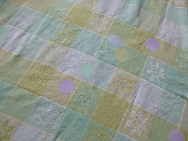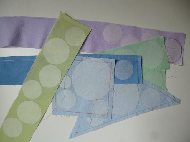 Mindenekelőtt kivágtam ragasztófátyolból sok-sok köröcskét különböző méretekben, és rávasalgattam a vászondarabkákra.
