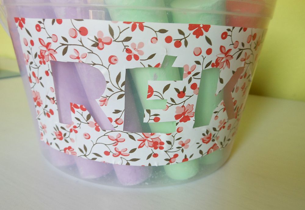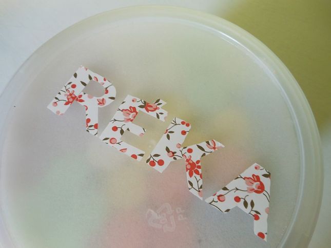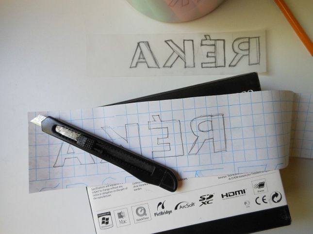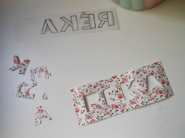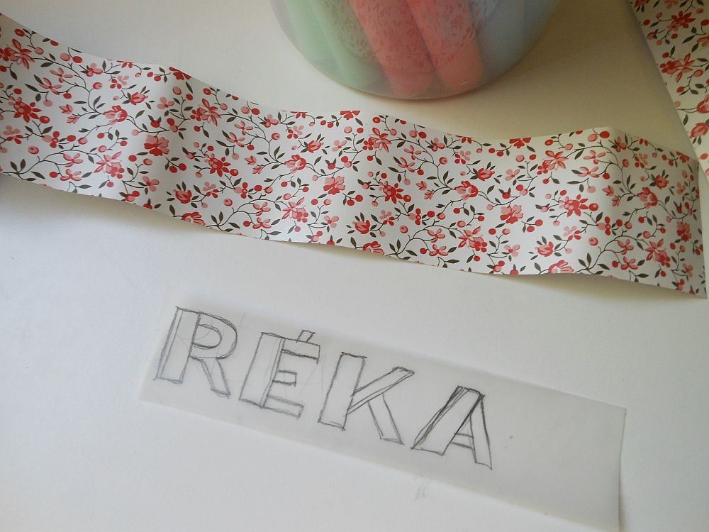 aztán rátettem az öntapadós tapéta hátuljára, színével lefelé fordítva, és újrarajzoltam a betűket.