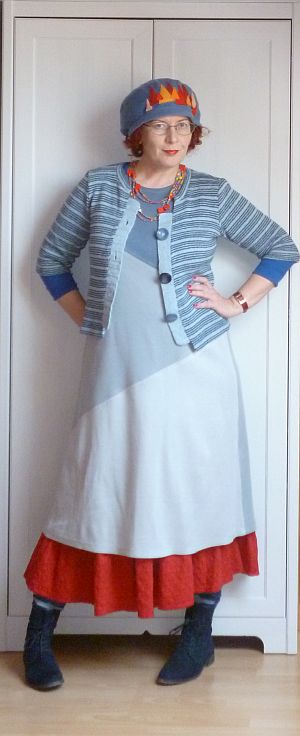 Azt hiszem, a blog olvasói eddigre összerakhatták maguknak, hogy szabásminták, de különösen házilag összeácsolt ruhák esetében én olyan kiszámítható és eccerű vagyok, mint a pof. Ami nem valósítható meg trikotázsból, max. egy nap alatt, cipzárak-gombok és más záródási megoldások nélkül, azzal csak szökőévente egyszer foglalkozom. Ennek egyik folyománya az is, hogy amikor azt mondja a ruharecept, hogy “könnyű, vékony anyag”, akkor én azt úgy fordítom le, hogy “vékony pólóanyag”; amikor azt, hogy “közepes vékonyságú, jó tartású szövet”, azt úgy, hogy “vastagabb pólóanyag”; amikor pedig azt mondja, hogy “vastag, puha szövet”, akkor azt úgy, hogy “polár”. Ez persze még hobbivarrói szemmel is nagy no-no, a ruhareceptekhez nem véletlenül vannak anyagajánlatok, és néha sikerül is elég csúnyán ráfaragnom, amikor kiderül, hogy az adott holmi marhára nem működik rugalmas anyagból, de hát most mit csináljak, lusta vagyok, slussz. Még mit nem közbélés meg cipzár meg alátét meg izé. Éljen a trikotázs.