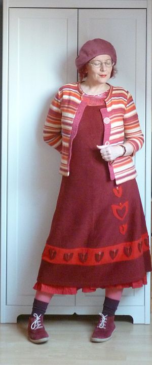 A ruha alá azért kellett felvennem egy plusz szoknyát, mert ez a dög anyag azonnal felkap, ha vastag harisnyához hordja a cuccot az ember, márpedig vékony harisnyával csak nem indulhatok világgá egy olyan napon, amikor a Dunántúlon már havazik is. És ha már felvettem a piros szoknyát, akkor miért ne jöttek volna a katicák is meg a téli sapka? Meg tudok én ideologizálni mindent, feleim, még azt is, amikor úgy nézek ki, mint egy középkorú középcsoportos.