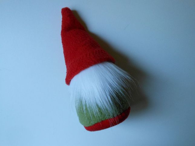 Ráhúztam a tomte fejére a sapit, elegyengettem, aztán azt is kézzel, láthatatlan öltésekkel felvarrtam a fejire neki; mint az alábbi képen is látható, azon a vonalon, ahol a sapka visszahajtása volt.