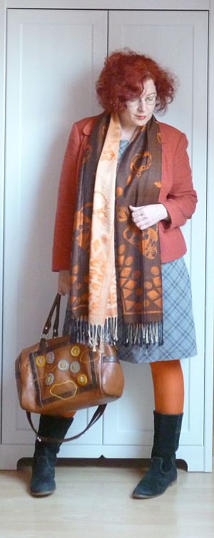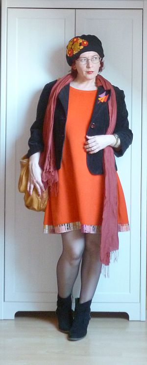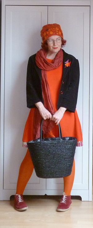 A ruha alá azért kellett felvennem egy plusz szoknyát, mert ez a dög anyag azonnal felkap, ha vastag harisnyához hordja a cuccot az ember, márpedig vékony harisnyával csak nem indulhatok világgá egy olyan napon, amikor a Dunántúlon már havazik is. És ha már felvettem a piros szoknyát, akkor miért ne jöttek volna a katicák is meg a téli sapka? Meg tudok én ideologizálni mindent, feleim, még azt is, amikor úgy nézek ki, mint egy középkorú középcsoportos.
