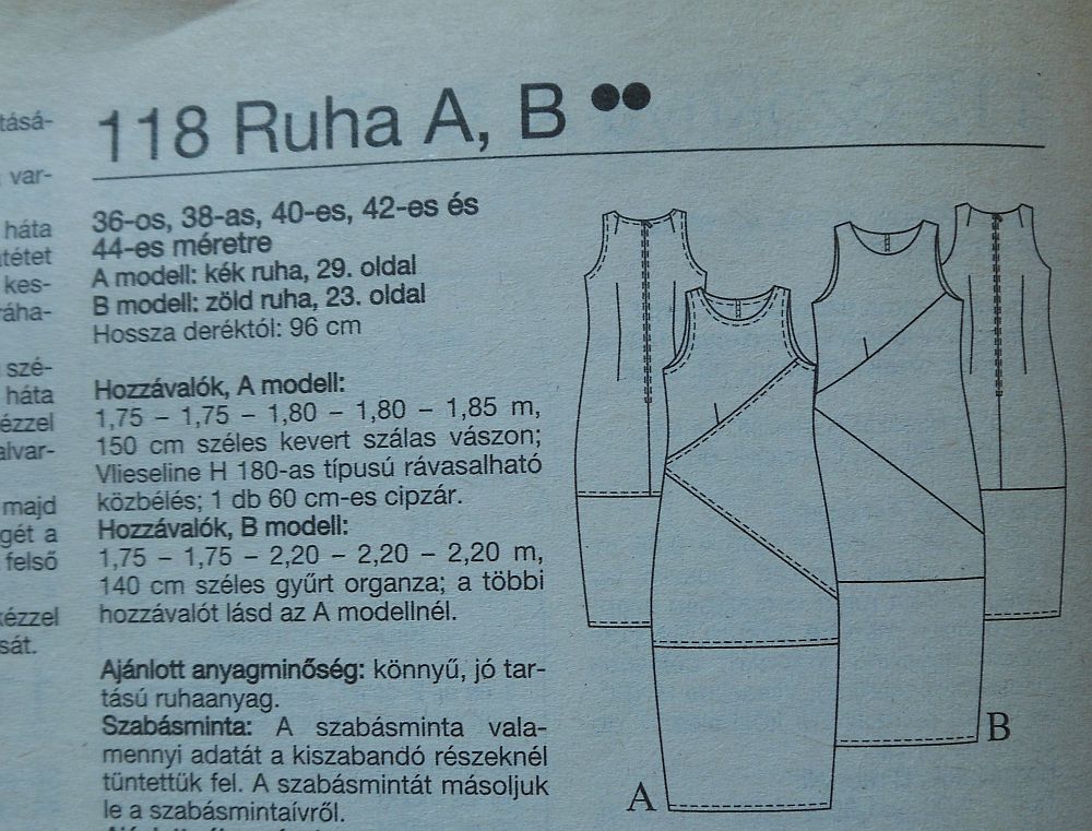 Deréktól 96 centi, nekem az garantált hasraesés. Ezen a ponton persze már az is világos volt, hogy amikor én ennek nekilátok, nem lesz ám ott cipzár meg közbélés meg alátét meg anyámkínja, de még ferdepánt se, visszahajt, cikcakk, oszt jól van. Az egész cucc összesen négy darabból fog állni, egy hátulja, három eleje, a legalsó cakkot meghosszabbítom húsz centivel, oszt megnézzük, működik-e ebben a formában is. Emellett pedig hát persze hogy mindegyik cakkot más színű anyagból csinálom meg, ne vicceljünk. Nincs ezeknek ott a Burdánál fantáziája? Egy ilyen vicces szabásmintához igenis kijár, hogy annyiféle anyagból készüljön, amennyit csak fel tud vonultatni az ember.