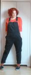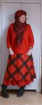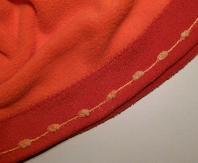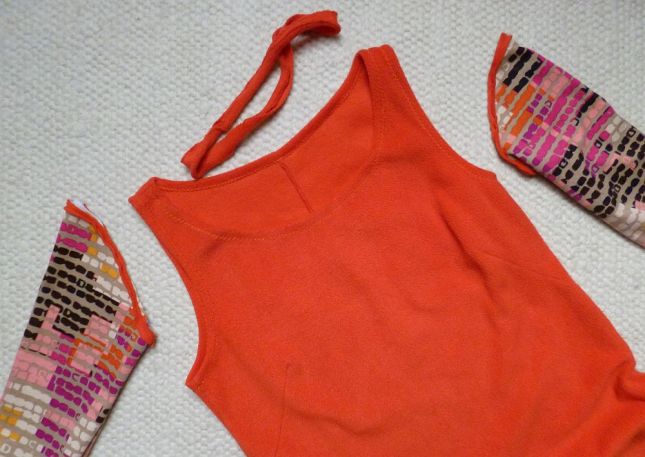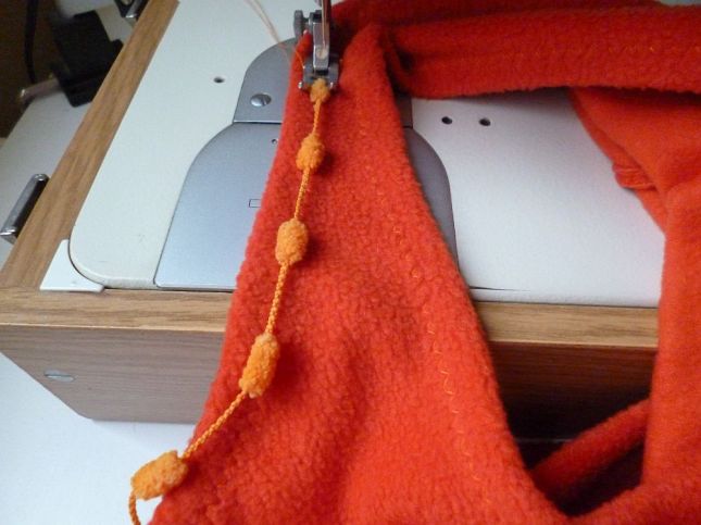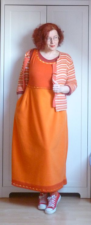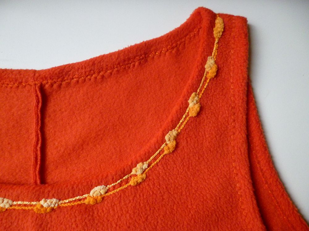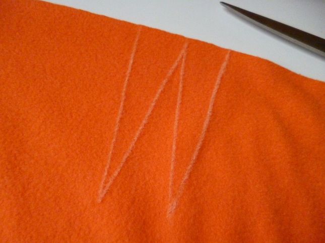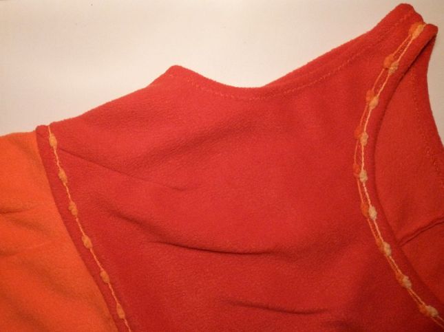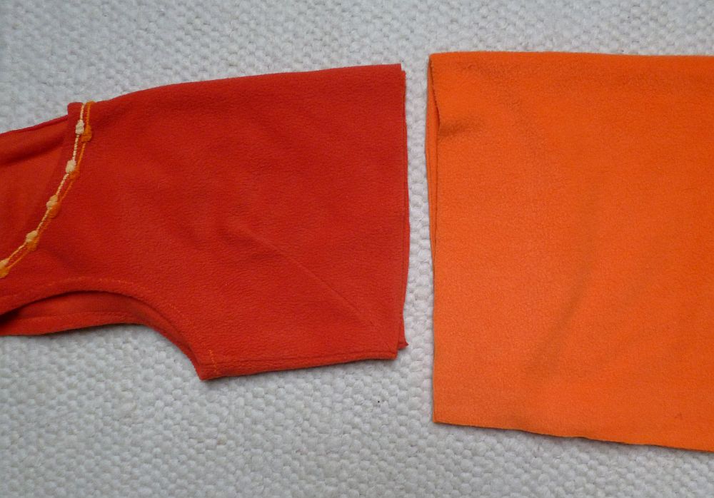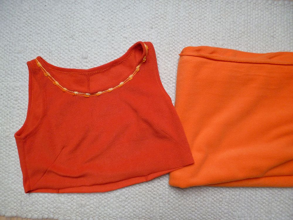A balra látható világosabb narancs polárra várt az a sors, hogy abból legyen majd a szoknyarész – ki is vágtam belőle két hozzávetőleges téglalap-formát, ami messziről és hunyorítva szoknyának látszott.