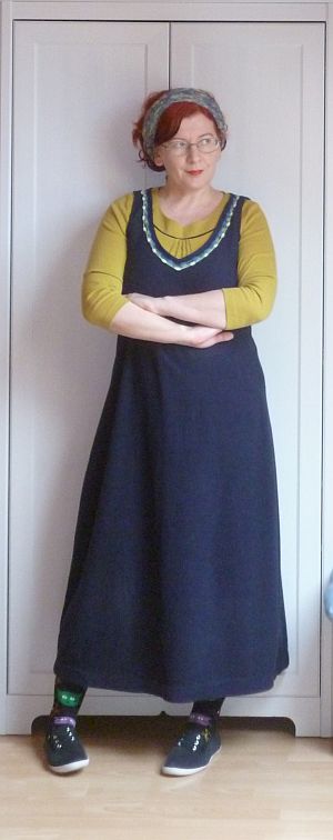 végül pedig a ruha eredeti szoknyarészének aljáról levágtam egy csíkot, és ráapplikáltam a jelenlegi kötényruha-aljra, avec effektfonal meg minden.