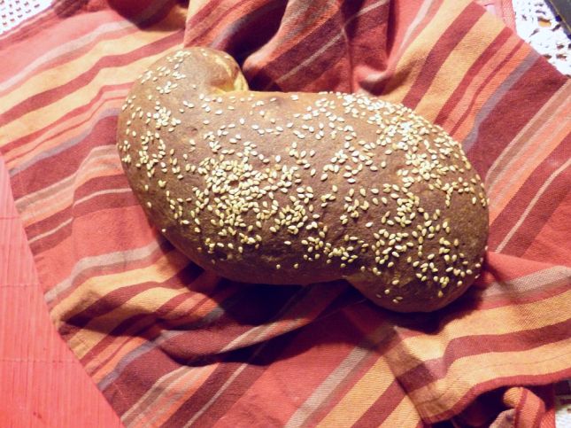 Bazz, kedveskéim, ezt a sikerorientáltságot napról napra nehezebb összehozni. Luca napja tiszteletére úgy döntöttem, hogy sütök Luca-kenyeret a szicíliai pékek módjára. Két napig készült, és a végén úgy kellett volna festenie, mint egy szemüvegnek, ehhez képest hogy néz ki, hát hogyan, pont mint egy óriás meztelencsiga, szezámmaggal.