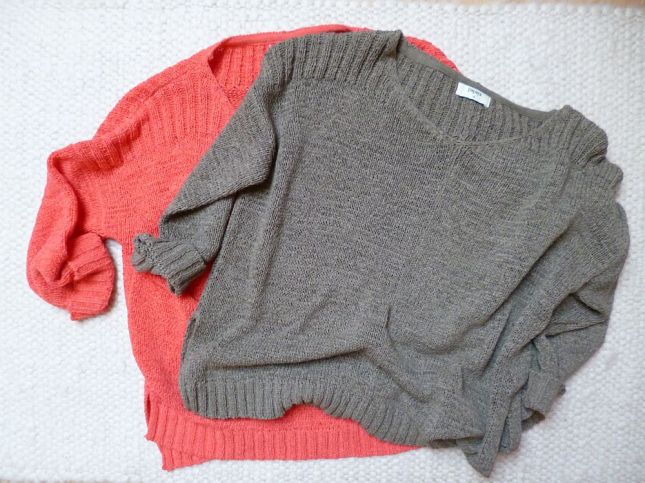 Nos, lássuk a medvét. Első számú medvénk egyből kettő darab medve, két tökegyforma pulcsi más-más színben. A korall az idei év Pantone színe, ezt csak a szórakoztatás kedvéért említem, mert egyébként eddig is dugig volt korallszín cuccal a szekrény, pólótól szoknyán és dzsekin és kabáton és nemtommin át cipőig. Mindenesetre ezek majd jól jönnek nekem tavasszal.