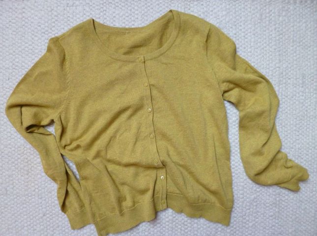 Item, sárga kardigán. A két sárga kardigánomból az egyik igen határozottan megy kifelé a forgalomból, kicsikét már romos. Ez itt enyhén pipeződbe-mustárba hajló sárga, amit nem óhajt teljes pompájában visszaadni nekem a fényzőgép. Ez van, no.