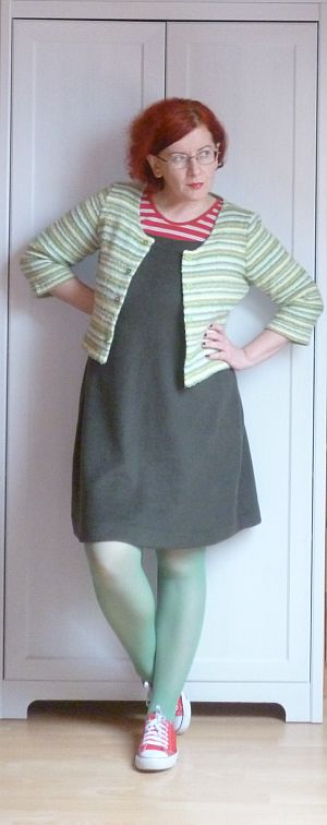 Én pedig ezen a ponton elkövettem azt a hibát, hogy visszavarrtam az ujjakat. Ez tényleg hiba volt. Nagy. Előtte megadjusztáltam ugyan, hogy pontosan beleilleszkedjenek a karkivágásba, de akkor is, valami csúnyán félrement, én pedig hangos káromkodások közepette mókázni kezdtem a fércszedővel. Mire befejeztem, túlságosan be voltam pöccenve ahhoz, hogy folytassam a melót, abból csak baj lett volna, úgyhogy most így állunk.