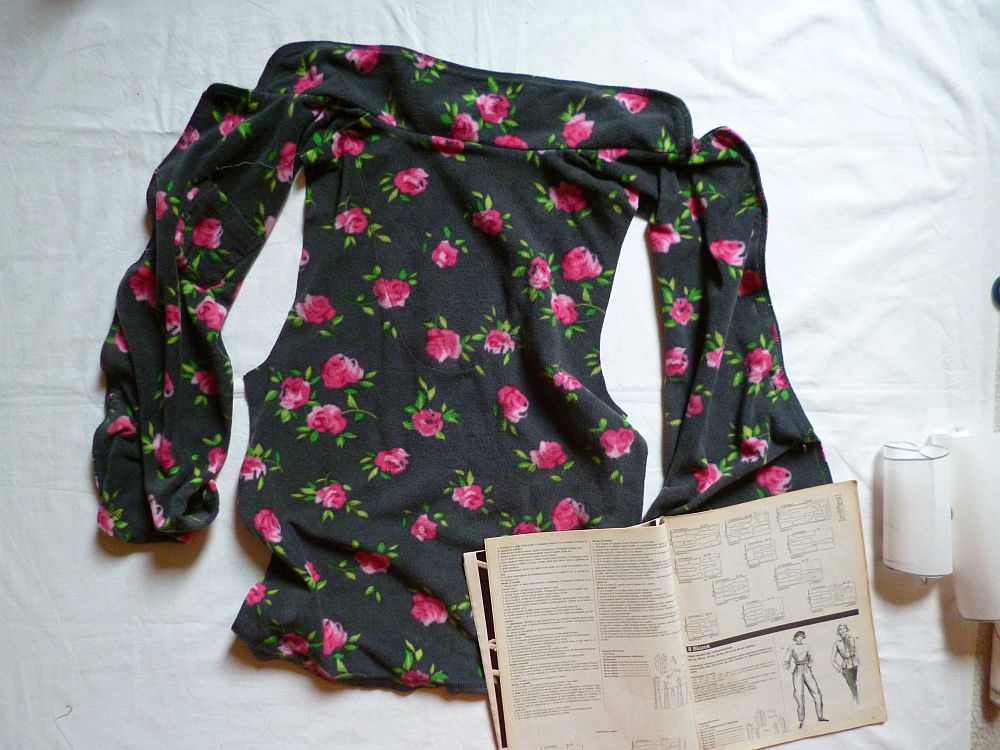 Először is nekiláttam összeácsolni a pizsifelsőből egy ruha felső részét. Kegyelettel kivágtam az ujjakat, aztán előkotortam egy hétszáz éves Burdát (konkrétan egy Miss B-t, 95/3).
