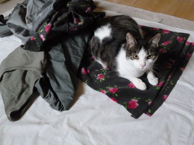 Amíg én azon gondolkoztam, mivel egészítsem ki a fentieket, minekutána a három együtt sem lesz elegendő (a trikóruhát alsóruhának szántam, szóval az lényegében nem játszik), bejött Poci, és teljes természetességgel elfoglalta a helyét.