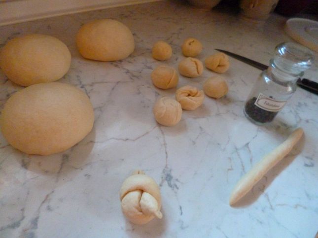 Egy órával később könnyedén átgyúrtam a tésztát, majd ráborítottam a tálat, és hagytam még kelni negyedórát. Utána ismét átgyúrtam, négy részre osztottam. A négy tésztahurkát 10-10 részre vágtam, és az összesen 40 darabból ceruza hosszúságú rudakat sodortam. A ceruzányi rudacskákat csomóra kötöttem, a csomóból felülről kilógó részt ujjbeggyel hegyesre összecsippentettem, (Mondtam én, hogy kell majd fázisfotó.)