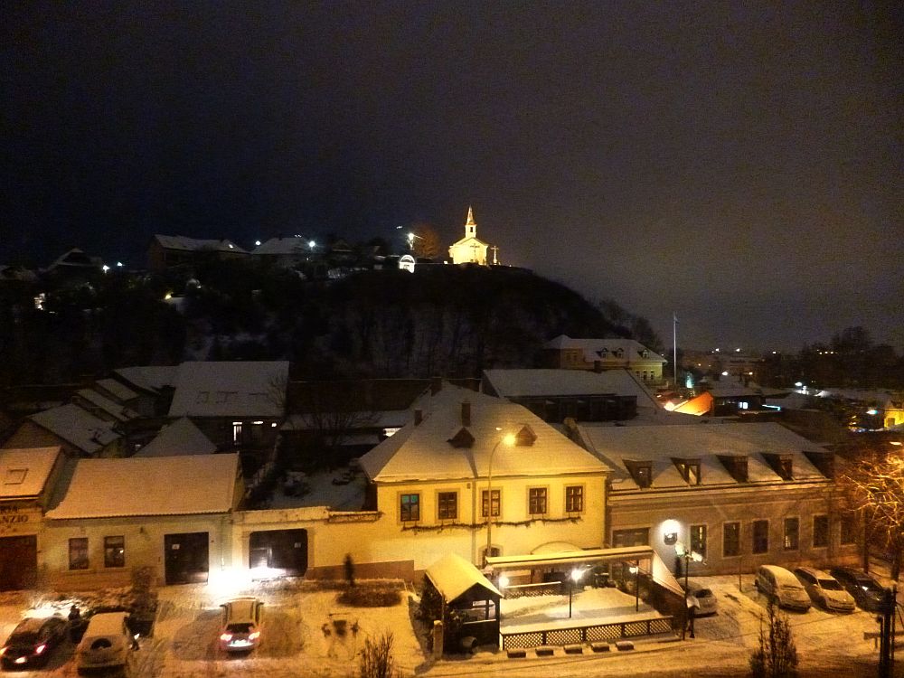 Ami az időjárást illeti, én még mindig rohadtul fázom, és a következő kétésfél napban sem kecsegtetnek sok jóval hőmérsékileg, úgyhogy némi morgolódással polárholmikban nyomom végig a diliházat, melynek szerves részeként ma este fél kilenckor fel kell kúsznom egy csomó látogató hallgatóval a Szt. Tamás-hegyre. Ez egy úgynevezett city trail bulika lesz, ami, ha jól értem, arról szól, hogy fel-alá kószálunk a zegernyében, az ifjak meg közben tereptárgyakat keresnek vajmi. Abszolúte jellemző egyébként a helyzetre, hogy midőn enyhe tanácstalansággal és növekvő kétségbeeséssel megkérdeztem, ugyan hol a túróban van a Szt. Tamás-hegy, a kollégáim szó nélkül kimutattak az ablakon a kálváriadombra, amit én fotózni szoktam. Pofám bőre gyere le. Na sebaj, legalább eltévedni nem fogunk, vagy ha mégis, nem esznek meg a farkasok. És túracipőt is viszek.