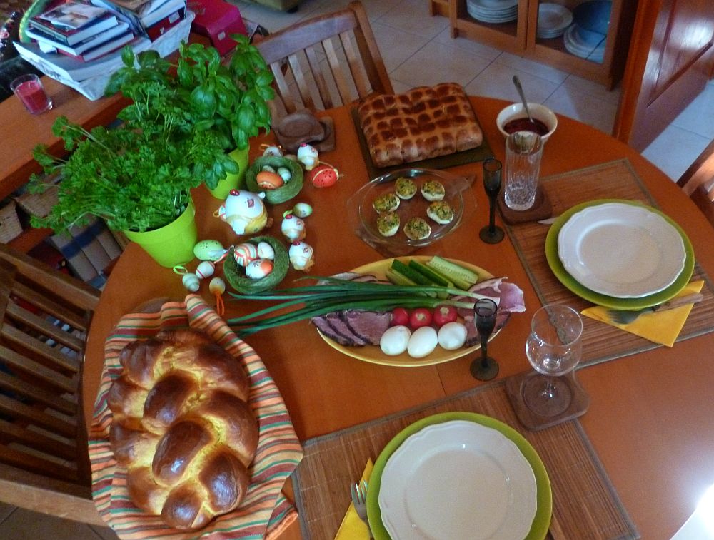 Mindenesetre összes küzdelmeinkkel és gondjainkkal (tegnap a keménytojás-főzés sikerült igen kalandosra, zengett tőle a ház is, a macskák meg úgy nézegettek minket, amint éppen lila fejjel visítunk, mintha Wimbledonban lettek volna, szerva itt, szerva ott), ezt sikerült összerakni a mai villásreggelire: