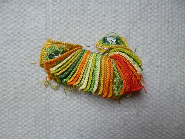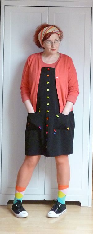 Mint ez sejthető volt, egy ilyen kötényruhából az ember akkor se képes elegáns-csinos darabot gyártani, ha fejreáll, tehát az volt az egyetlen opció, mókás legyen és megmosolyogtató a végeredmény. Egy fekete holmiból mókás darabot gyártani, úgy vélem, egyetlen módon lehet: megszórni tarkabarkával. Úgyhogy ezúttal eccerű voltam, mint egy pof, még Erik segítségét sem vettem igénybe, hanem csak kicseréltem a búbarna dekorációs gombokat színeskékre. Konkrétan csupán dísznek voltak ott az elején (dísznek? ezek? a világ egy hülye hely), funkciójuk egy szál se – nem volt hát kérdéses, hogy ebben az esetben akármekkora és akárhány gombot használhatok, például az eredeti hét helyett tizenkettőt. A zseb alatti kiégetett likat bestoppoltam, és azt is gombokkal takartam el, ami persze hozta magával az összes többi gombot is, hollári-hó. Ha egyszer lesz rá több időm, még melózhatok rajta: a középső sávon a színátmenetes gombkollekció minden bizonnyal megmarad, de a liktakaró gomb és annak testvérkéi helyett lehet, hogy egyszer majd valami teljesen más dolog jelenik meg, rátét vagy hímzés vagy horgolás vagy mittomén. Egyszer majd.
