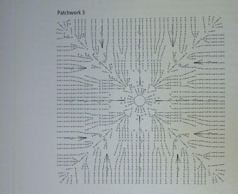 Mint láthatjátok, a közepe majdnem ugyanaz, mint a közepes patchwork-négyzeté, és addig el is boldogultam vele, de a folytatásban olyan tragikusan összekutyulódott minden, hogy öröm volt nézni.