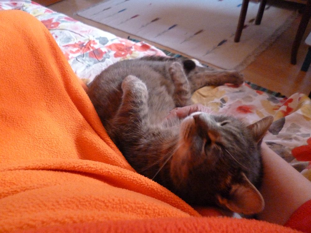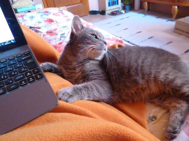Mindeközben (helyzetjelentés) a szőrös vendég azzal töltötte a tegnapi nap javát, hogy az állatorvosi látogatás után sértetten behúzta magát a mosókonyha leghidegebb sarkában a fémpolc alá egy akkora helyre, amekkorára csak egy macska képes beszuszakolni gáznemű testét, aztán ott maradt. Nem evett, nem ivott, nem pisilt, nem kakilt, viszont dorombolt, amikor simogatni próbáltam (jó vicc, a kezem is alig fért be a polc alá). Ez volt mindaddig, amíg meg nem jelentem a Repülő Kutató háromhúsos-másnapos orosz káposztalevesének előkészületeiből megmaradt pár marhahús-cafatkával. Az első darabkát még némi magakelletéssel és gyanakvó szaglászással fogyasztotta el, az összes többit viszont azonnal felszippantotta, majd lényegében minden átmenet nélkül hanyattvágta magát, hogy simogassam. Én még ilyen gyors kapitulációt nem láttam felnőtt macskától, Pocinak például egy hetébe telt, amíg kegyeskedett kijönni az ágyneműtartóból a téli paplan és a kisbalta mellől (mér, ti hol tartjátok a kisbaltát, nem az ágyneműtartóban?). Istenbizony, alig tudtam levakarni magamról, hogy visszamehessek kenyeret sütni. Mikor egy órával később visszatértem, addigra már megette az összes szárazpapit, kakilt, pisilt, és érkezésemre ismételten hanyattvágta magát. Te strici. Ha itt maradsz a nyakunkon, nem is merem elképzelni, Poci mekkora oltári nagy balhét fog rendezni, Puccini-operákban sincsenek olyan féltékenységi jelenetek, mint amilyeneket akkorra prognosztizálok. Már most is olyan hosszú nyakkal szaglássza a gatyám szárát, amikor visszatérek a mosókonyhából, mint egy szurikáta.