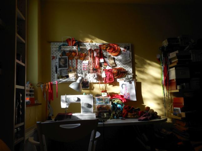 A képen két egyidejű akció látható, az egyik az általam nautilusoknak nevezett polárvirágok gyártása. Ezt akár be tudom majd mutatni külön is, de asszem eléggé érthető: szabálytalan félhold formájú ficnikre van hozzá szükség, amelyeket a sarló keskenyebbik szélén végigöltöget az ember tűvel-cérnával, aztán összehúzza az öltéseket, és elegyengeti a virágot. Lehet pucéran is hagyni, de az is egy lehetőség, hogy gombot varr a közepére, akkor bibéje is lesz annak a virágnak.