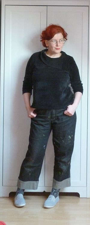 A képen amúgy roppantmód mosatlan hajamon kívül egy csak-itthonra-jó zseníliapulcsi látható egy csak-koszolós-hadműveletekhez félretett, de amúgy technikailag kidobott törött talpú tornacipő társaságában, a kettő között pedig a fürdőszobafestő gatyám. Ez nagy és röhögséges tetszést aratott, hogy nekem van egy fürdőszobafestő gatyám, úgyhogy muszáj leszögeznem: más termeink festéséhez is ezt használom, de a majdnem négy évvel ezelőtti fürdőszoba-festés során jutott el szegénykém abba a stádiumba, hogy az utcára csak akkor lépnék ki benne, ha ég a ház, és éppen ez van a seggemen.