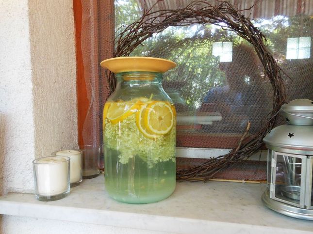 A cukrot 2 liter vízzel felforraltam, majd az üvegbe rétegezett bodzavirágokra, citromra és citrompótlóra öntöttem. (Vigyázni kell, nehogy elpattanjon a forró létől az üveg – nekem egyszer egy üvegem és egy teljes adag bodzaszörpöm és egy tiszta konyhám bánta. Talán az a legjobb megoldás, ha a töltögetés a mosogatóban történik: a fém elvezeti a hőt, és ha mégis kreccs, akkor legalább nem kell cukros-citromos-üvegszilánkos levet törölgetni az egész konyhában.)*** Miután kihűlt, ez is tányérkát kap a tetejére, viszont kamra helyett a pincében fog kikötni, ahol hidegebb van. Ha egy hét múlva még nem pezseg, leszűrve tiszta üvegekbe töltöm, és a pincében tartogatom fogyasztásig. Ha ezalatt pezsegni kezd (egyszer előfordult), akkor valószínűleg elszúrtam valamit a főzés közben, de sebaj: ebben az esetben úgy kezelem, mint a limonádét, csak persze értelemszerűen több vízzel fogjuk felengedni.