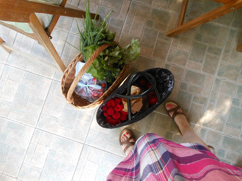 Ma viszont szombat van, vagyis a piacra is lementünk, én a most már szinte hagyományos piacjáró narancssárga böhömben, ami arra jó, hogy a RK ne veszítsen el a rukolák között.