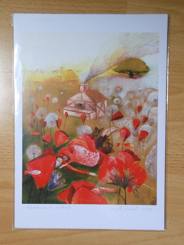 Én ma nem vagyok valami nagy élmény, de ha már a bűvöknél meg a hármasoknál tartunk, lőttem nektek egy fotót az egyik nyomatról, amit a Parti Medve nevű könyvesbolt-és-minden-másban vettem (nem fizetnek a reklámért). Szegedi Katalin munkája (ő sem fizet nekem a reklámért), és a Holle anyó “Kemence és almafa” jelenete van rajta.