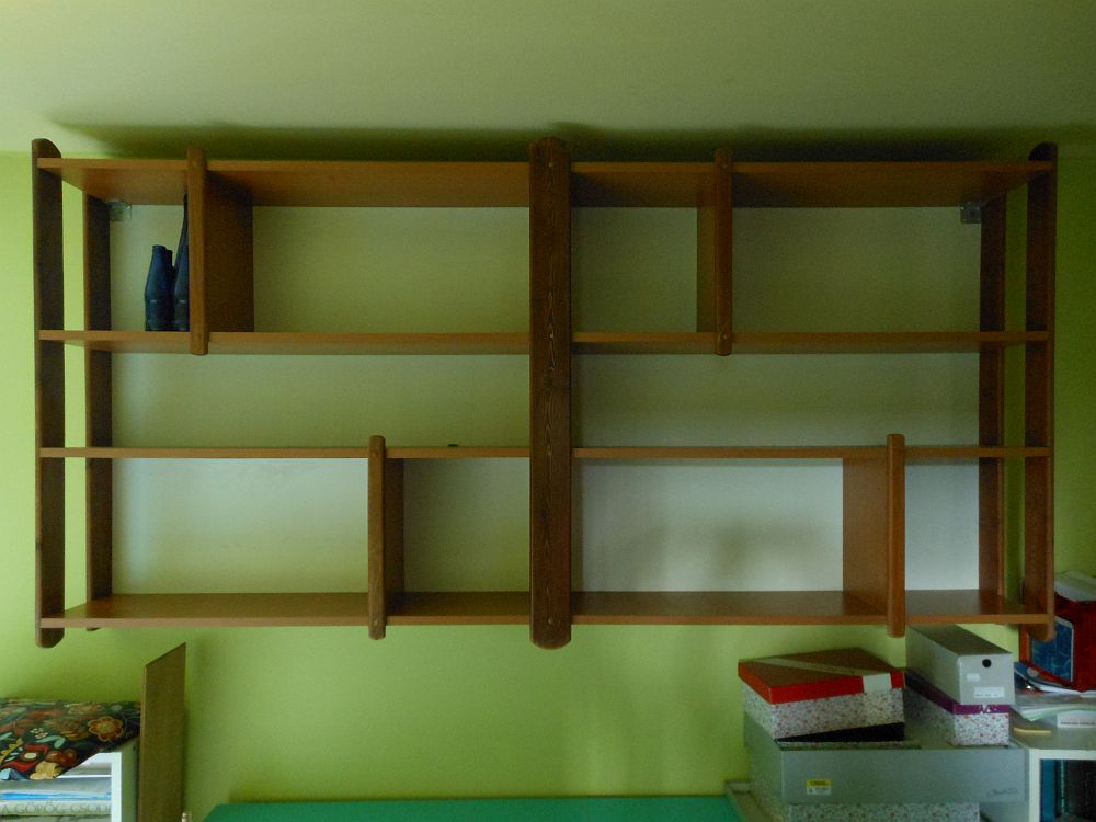 Az általános gondok egyik része nyilván maga a függőpolc, ami (mondanom sem kell) szintén uraságoktól levetett holmi, még anyósomék miskolci lakásából származik, és, ha jól emlékszem, sógornőm leányszobájában ült a falon. Amikor anyósomék mellénk költöztek, hozták ezt is magukkal, és használták is egy ideig, de aztán lett nekik jobb, mi pedig nyilván befogadtuk.** Úgyhogy lett nekünk a pipeződ falhoz meg a fehér bútorokhoz meg a kilencvenes-évek-türkize komódhoz egy basz nagy barna izé, ami jól összenyomta a teret.