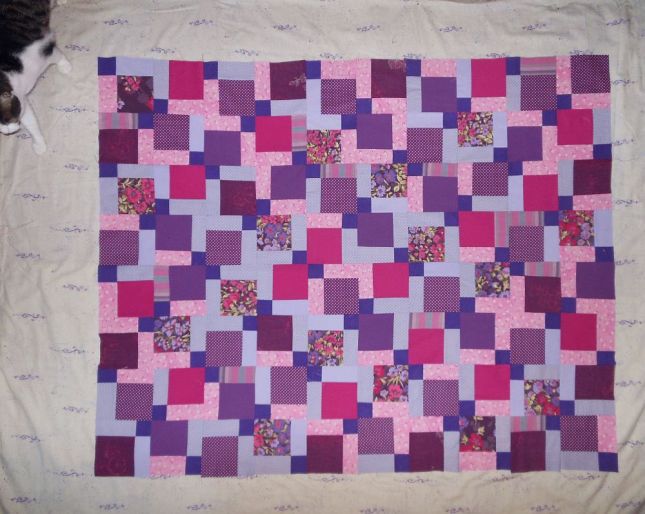 Bocs, hogy nem írtam be, de leginkább azért nem, mert én ezekben eléggé eltértem az recepttől. Az eredeti 5×5 hüvelykes négyzetekkel kezdte, de nekem a legvilágosabb lila anyagomból csak 11 centi széles csíkot sikerült vágnom, ezért 11×11 centis négyzetkékkel indult a dolog, háromféle színerősségben. A legsötétebb lila lett a blokk közepe, a sarkokba a közepes lilák/rózsaszínek kerültek, a többi helyre meg a világosabb lila/rózsaszínek. (Az látszik is az egyik fotón, ahol egymásra pakoltam a négyzeteket a kilences blokk formájában – onnan emelgettem le őket varráshoz. Az összevarrt kilences blokkokról csak egy olyan kép van, amin Poci éppen rajtuk fetreng. 🙂 )