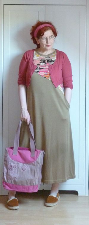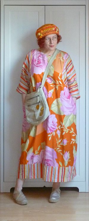 Ez lett a szép virágos anyagból. Az arányai némiképp el vannak baszarintva, de tudom, mi a baj, és hogyan lehetne rajta javítani. Majd. Egyszer. Ha olyanom lesz.