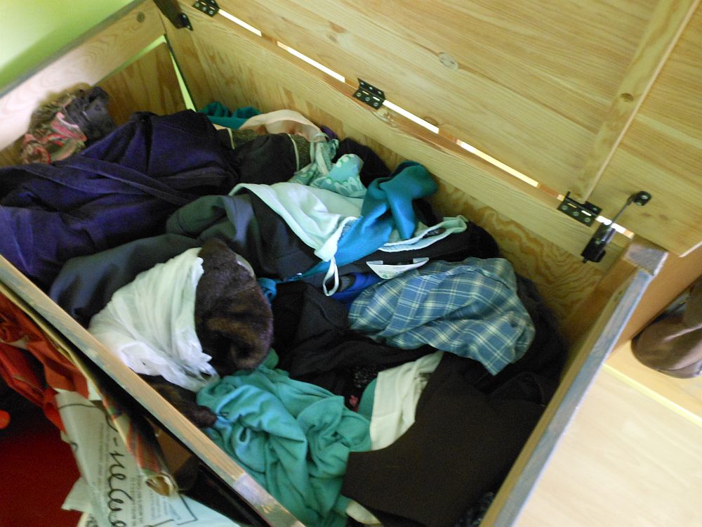 A ládáról még nem tudom, hogy szétverem és kidobom, vagy megmentem, de mindenekelőtt el kellett tüntetni belőle a cuccokat, meg ha már úgyis arra jártam, esetleg más cuccokat is. Egyszer egy könyvben olvastam, hogy az anyuka kínjában puffokat varrt, hogy legyen mibe eldugdosnia azokat a rettenetes ruhadarabokat, amiket a gyerekei kaptak mindenféle családtagoktól.