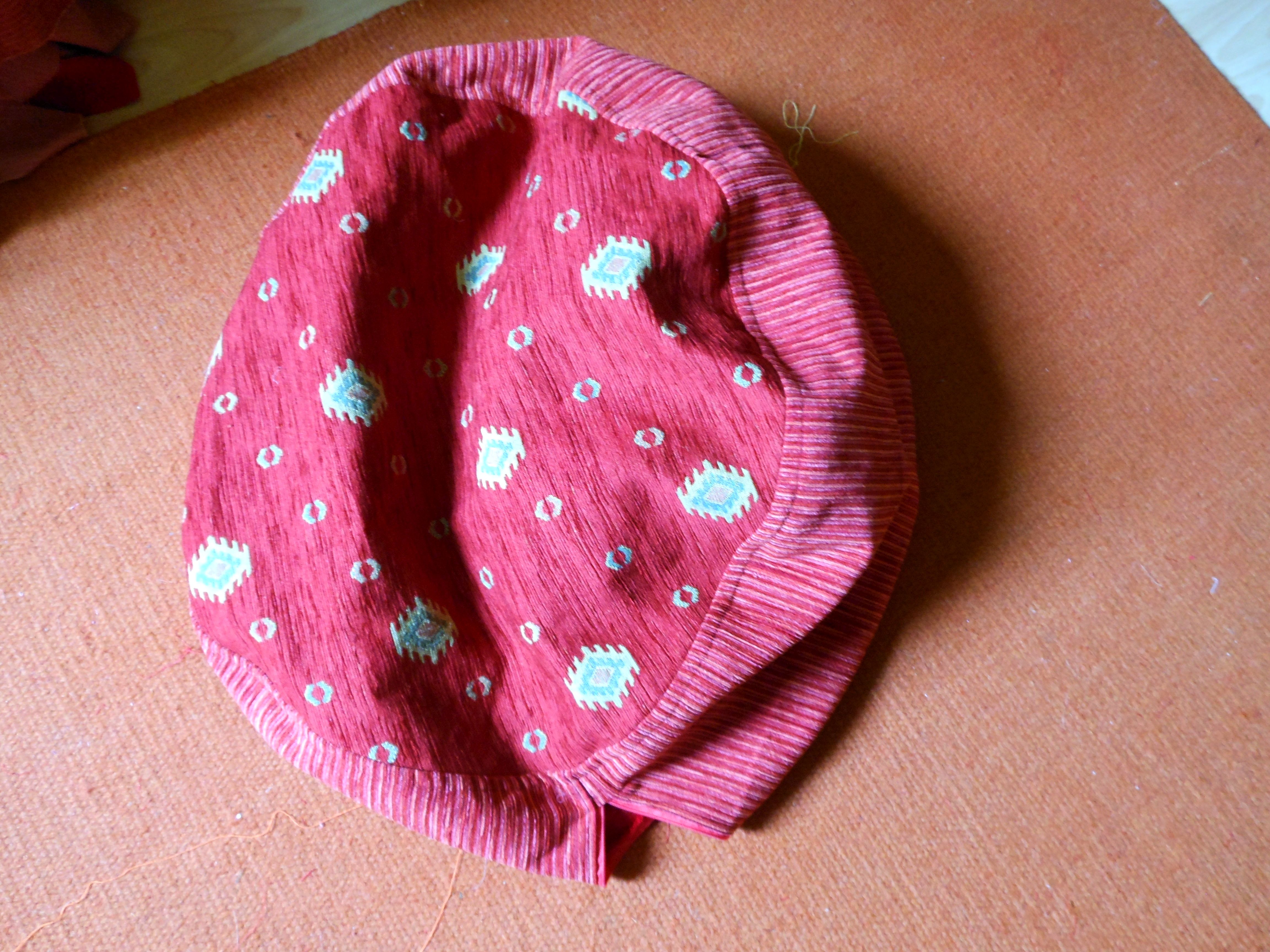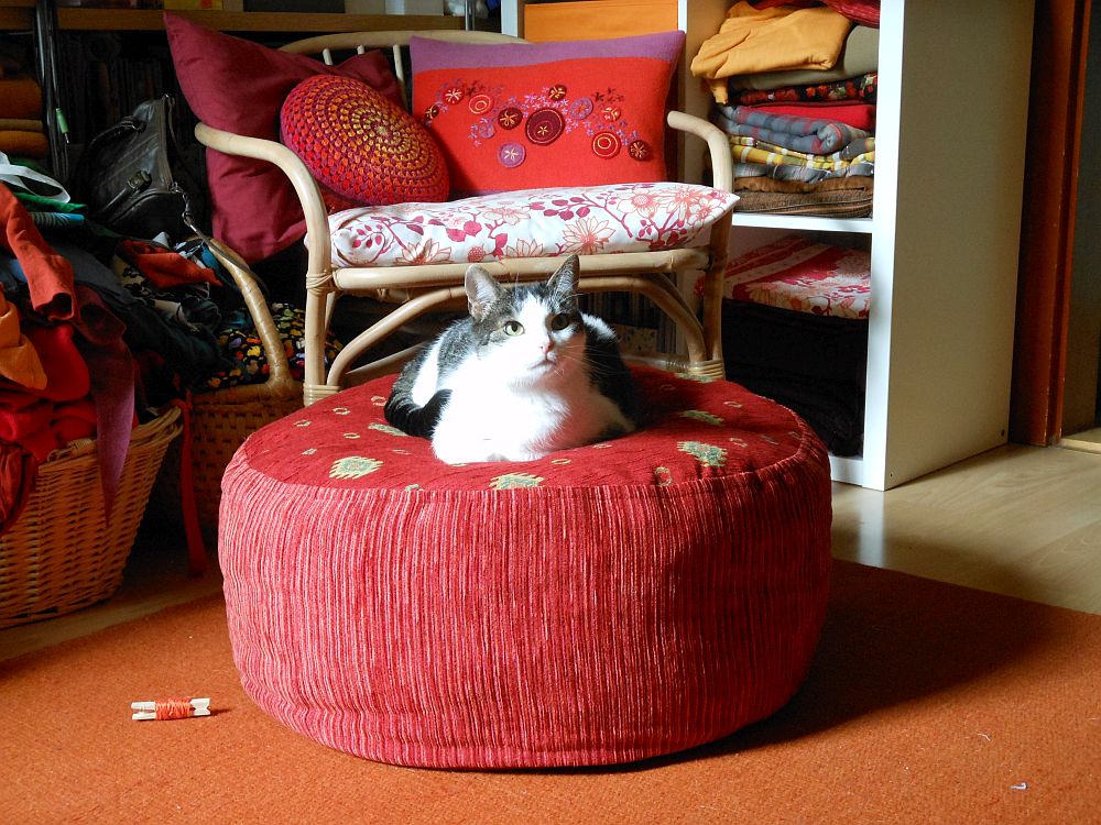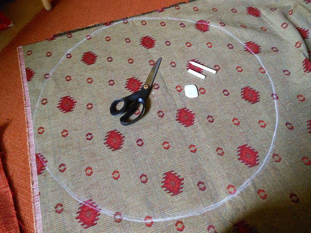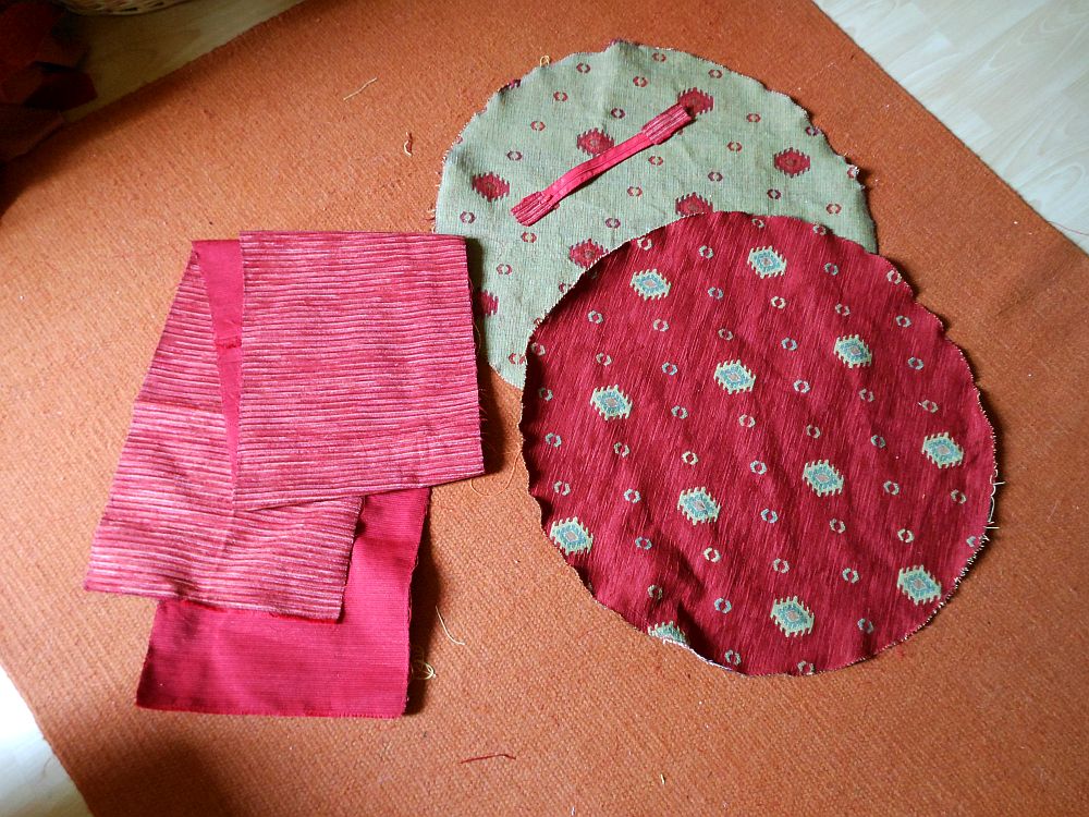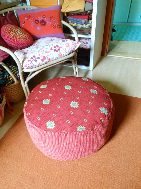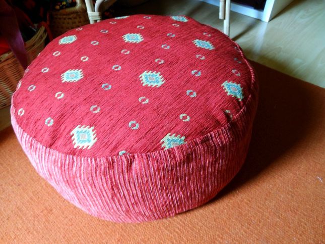 U.i.: Felmerült a kérdés, hogy milyen méretű darabokból áll össze a puff – nos, itt most azt írom le, én hogyan csináltam, de ha valakinek éppen nincs annyi anyaga vagy annyi beletömködni valója, máris lehet változtatni a dolgokon. A méretek, amikkel én dolgoztam: a két kör ráhagyás nélkül 58 cm átmérőjű (a kiszabott darabon kell még az átmérőhöz plusz 3 centi, hogy körbe-körbe mindenütt meglegyen a 1,5 centi varrásráhagyás); az “oldalfal” 30 centi széles. Ebbe az “oldalfal”-csíkba a 20 cm hosszú cipzárt úgy varrtam bele, hogy a csík egy folyamatos körré álljon össze, amelynek 182 centi a körkerülete.