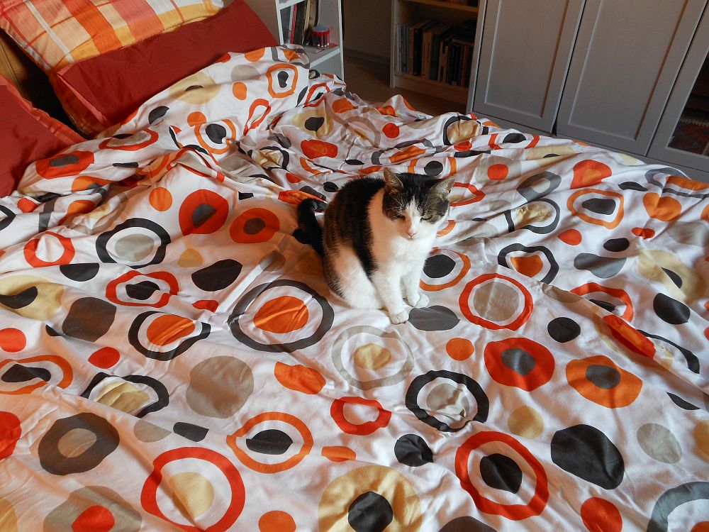 a frissen húzott ágyneműt felavató Pocival beszélgetek,