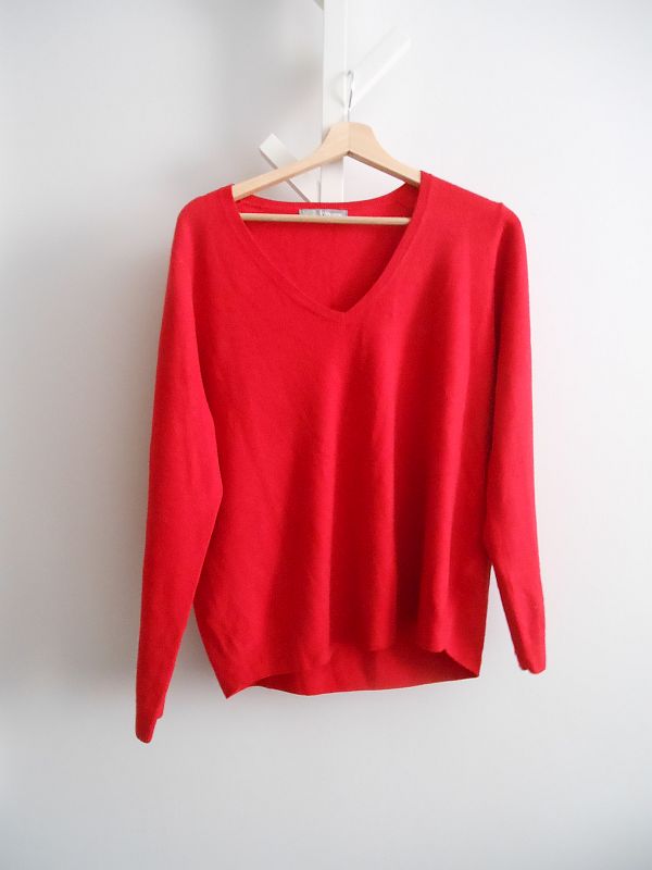 Vettem egy igen finom puha piros pulcsit is, aminek az elején viszont ménkű ronda foltok vannak – fotón nem látszanak, életben viszont igencsak, de már van rá ötletem.