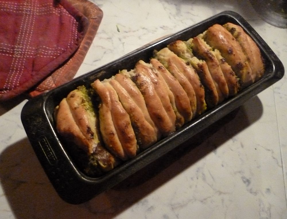 Ha már lendületben voltam, gondoltam, nem hagyom veszni, úgyhogy sütöttem vacsorára a brokkoli-krémleveshez egy cincálóskenyeret is (még nem tudtam jobb magyar nevet kitalálni a pull apart bread-re). A szokásokhoz híven persze úgy kezdődött ez az egész, hogy volt néhány maréknyi egyre bánatosabb rukolám, amiből csináltam mandulával meg cheddar sajttal pesztót, és azt kenegettem bele a cincálóskenyérbe. Fázisfotók nincsenek, mert csak későn kaptam észbe, de így festett, amikor bedugtam a sütőbe,