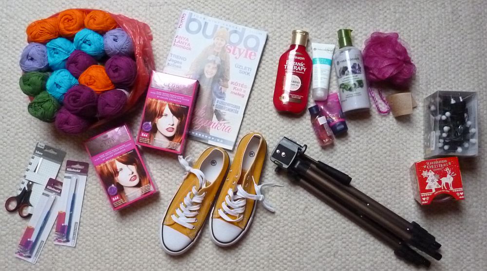 Voálá, itt az összes holmi, amit széles hátamon hazacűgöltem tegnap.