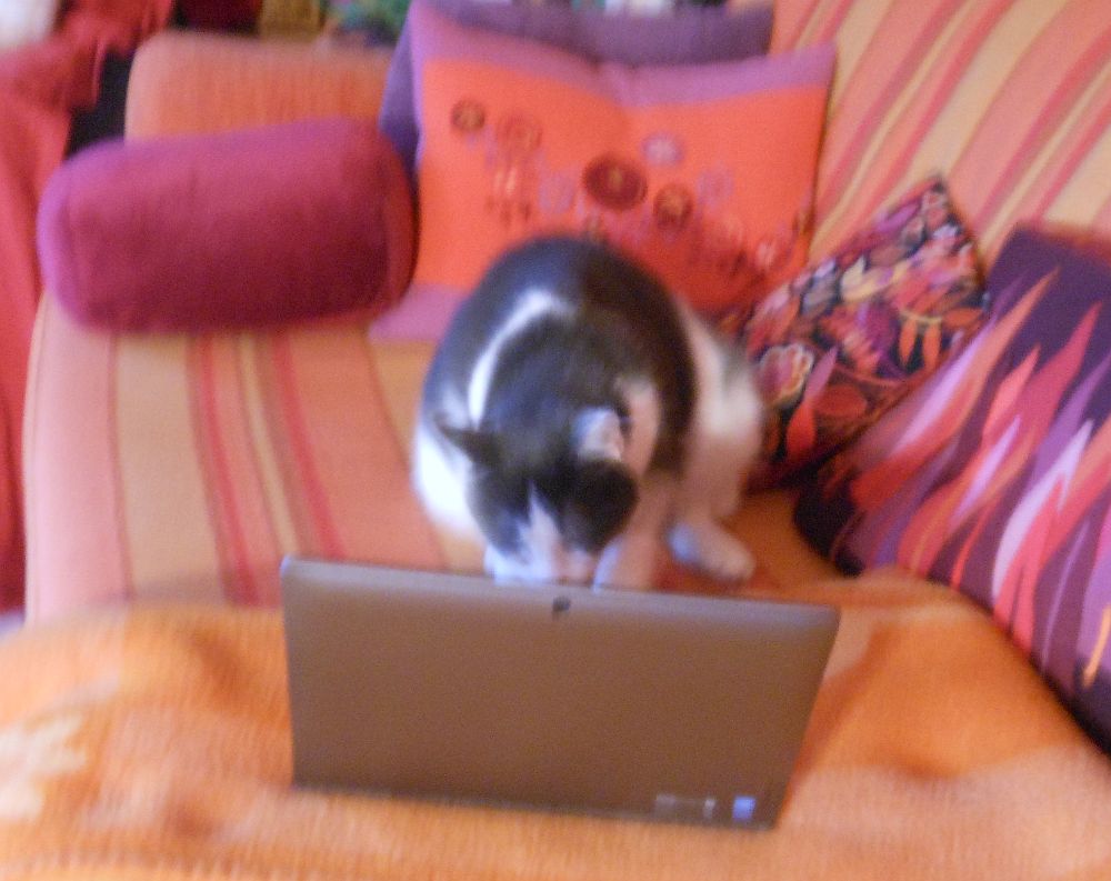 Minden eddigi macskánk teljesen analóg volt, csörgős labdákat akart meg cipőfűzőt, Maci ezzel szemben a modern kor gyermeke. Van képem arról is, amikor azon kaptam rajta, hogy Lénát bűvöli. (Elnézést a homályosságért, irgalmatlanul röhögtem fotózás közben.)
