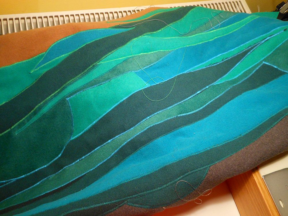 Az is igaz viszont, hogy ezt már csak holnap fogom leellenőrizni, mára éppen elég volt, hogy nagy bedühödésemben befejeztem-forma a falvédőmet, pontosabban felvarrtam cikcakkal az összes odagombostűzött szövetficnit az alapra. Ez még tényleg csak a kiindulópont, innen még vasalás lesz meg forgatás meg mindenféle pitykélések – részben dekorációs, részben pedig “takarjuk-el-a-legrondább-részeket” céllal. Mindenesetre mára ezzel befejeztem Erik buzerálását, mert itt esetenként tényleg több rétegnyi kabátszövetet kellett összevarrni, és mostanra, attól tartok, már szívből utál. Meg tudom érteni, én se vagyok igazán szimpatikus magamnak.