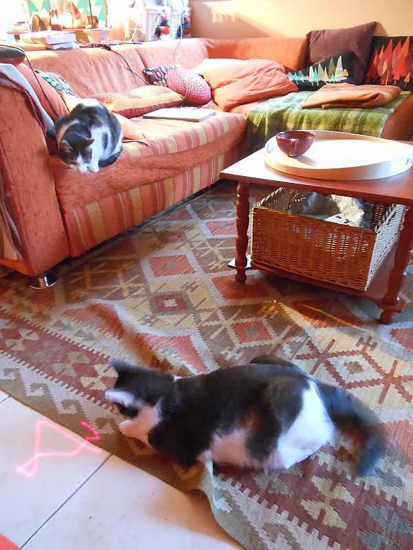 Apropó pötty: vannak macskák, akik megvadulnak a lézerpointerért, és vannak, akik nem értik a dolgot. Nálunk, mint a mellékelt ábra mutatja, most már mind a kettőből akad mutatóba.