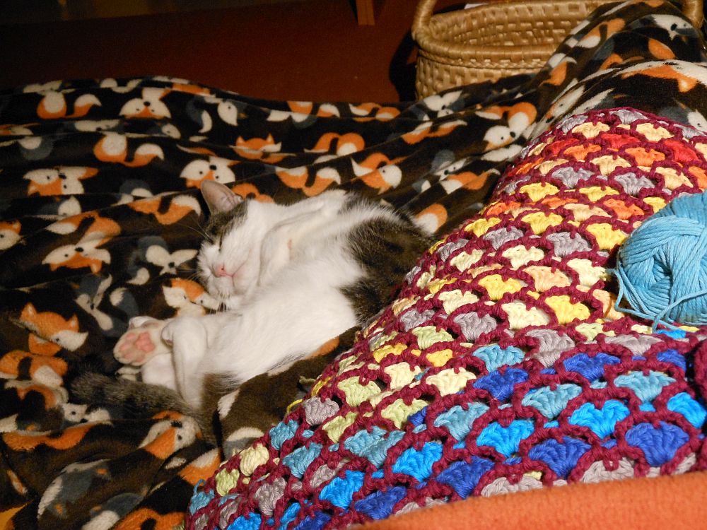 Mivel a dobozolás nem túl látványos, és én se vagyok hozzá túl elegáns, nesztek egy fotó Pociról meg az újabb készülő takaróról. Eccerű vagyok és repetitív, na.