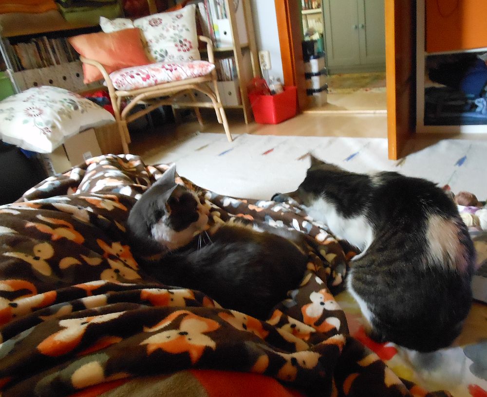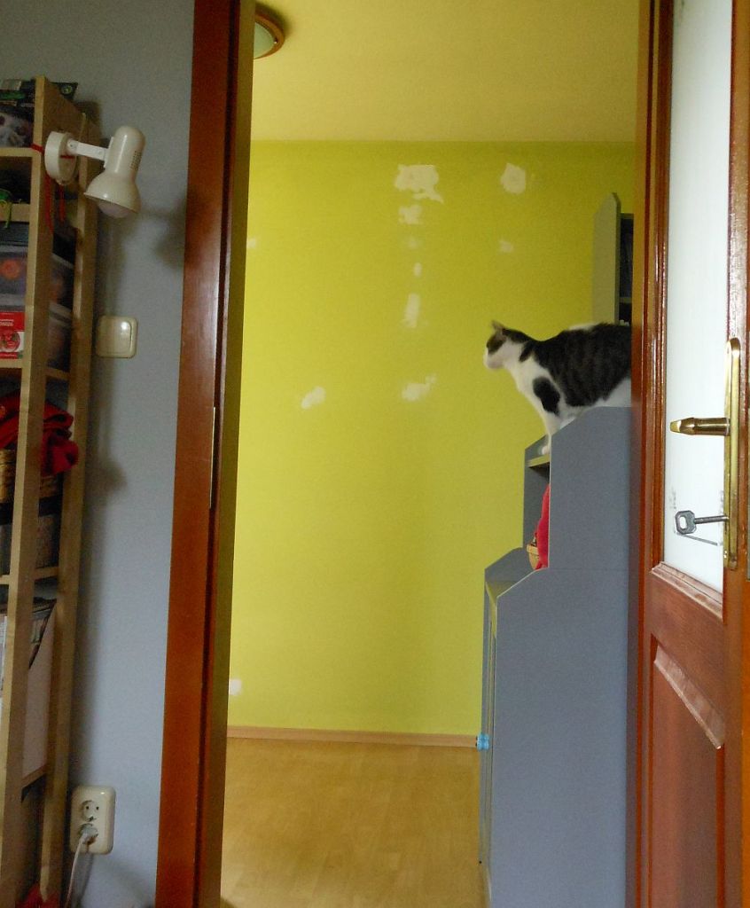 Mivel a hálószoba szerencsére kívül esik a közlekedési útvonalakon (ellentétben a folyosóval), én itt most nem vuzigálok vissza semmiccse, amíg nem leszek kész, márpedig legkésőbb holnaputánig kész kell lennem, akkor ugyanis más dógom lesz. Addig maradunk így, ahogy vagyunk. A pasi meg tudja közelíteni az ágyat, nekem ehhez ugyan kicsikét át kell másznom két komódon, de ez legyen a legnagyobb bajom. A macskák viszont istenbizony élvezik a helyzetet.