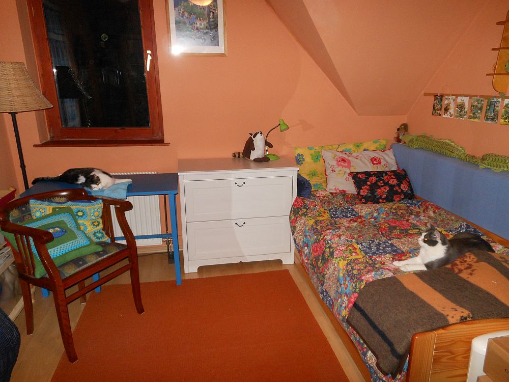 és emelje fel a kezét, aki meglepődött azon, hogy a bides kis mókusnyuszik azonnal birtokba vették. (Felhívom a figyelmet a bútortetriszben való profizmusomra, mellyel sikerült egy dög nagy Aspelund komódot besuvasztani az asztal meg az ágy közé, csak úgy. Egy távlati – de nem túl távlati – ponton egyébként alaposan fontolóra veszem a komód és az asztal lefestését azonos színre, mert most nagyon üvöltenek egymásra, jelenleg viszont örülünk annak is, hogy végre legalább nincs mindkettőnek a tetején egy méter magas kazalnyi akármi. Eddig az volt.)