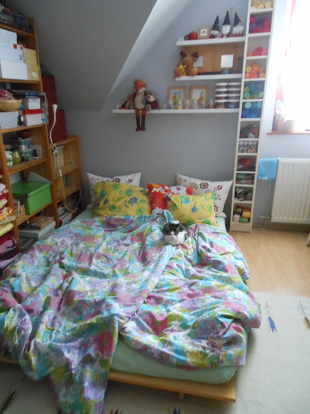 Újabb kismerénylet, ezúttal a hetek, desőt hónapok óta halogatott fajtából. Miután kifestettem a Bűnök Barlangját Ezüst Zsálya és Ezüst Cserje segítségével (aka Friss Cement és Másfajta Friss Cement), azt a szürke pépet fújták be a fejembe, hogy megpróbálom a szobát nyáron rózsaszínben, zöldben és szürkében, télen meg narancssárgában, bordóban és szürkében tartani. (Ez nyilván csak azokra a kiegészítőkre vonatkozik, amik huzatolhatók, a kupi többi része marad a már megszokott páviánsegg színű.)