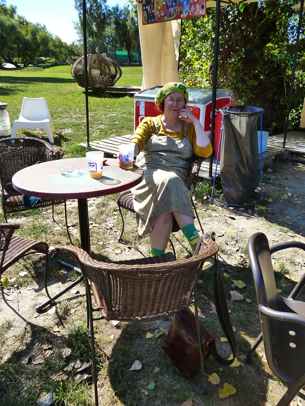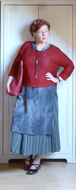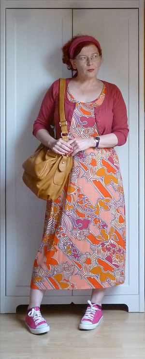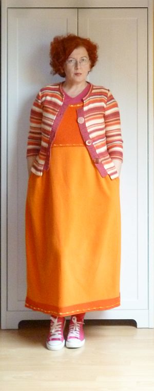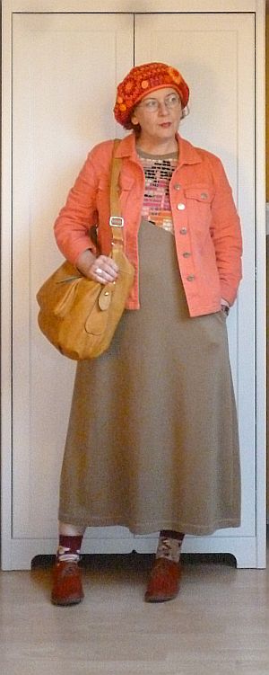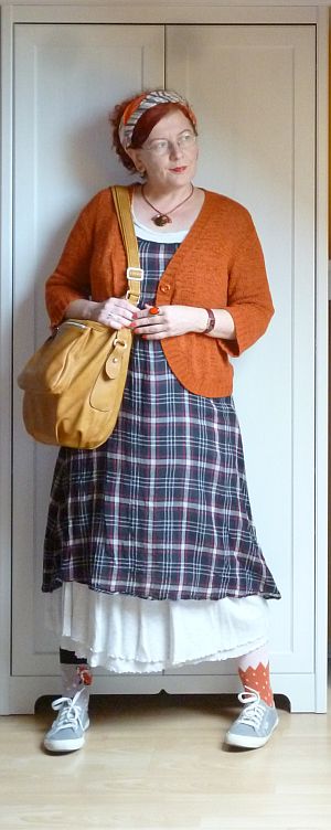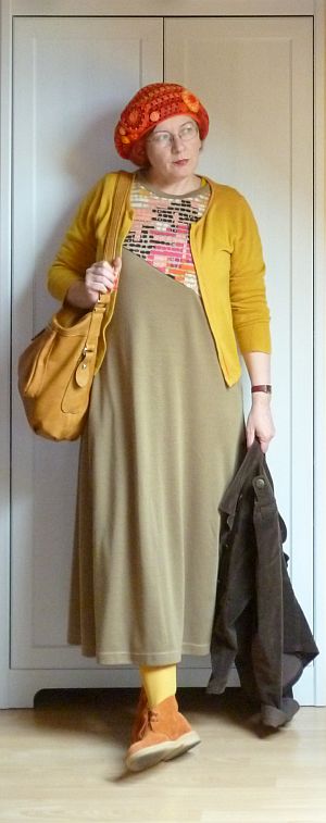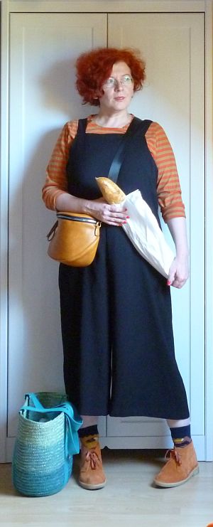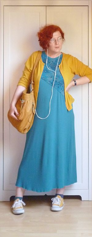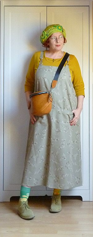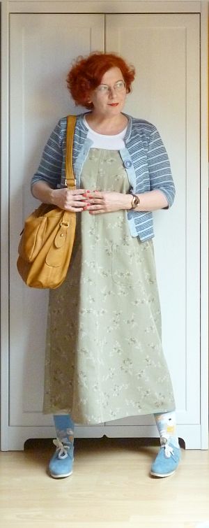 A vasárnapi áutfitjeim kezdenek igencsak egyformává válni: sapka a kriminális állapotú hajamra, kardigán egy kötényruhára, valamint kistáska meg kényelmes cipő. A közönség szórakoztatása végett viszont ezúttal előkotortam két, évek óta nem látott darabot: a pulóverből átalakított kardigánt meg a farmer kötényruhát, amit párezer évvel ezelőtt turkáltam magamnak Kőszegen. Az elmúlt időszak meglepetései után (egy csomó holmiba nem férek bele mellben meg hátban) gyanakodtam kissé, hogy már nem tudom belegyömöszölni magam, de a ruha kivételesen remekül vizsgázott, lényegében mostanra nőttem bele.