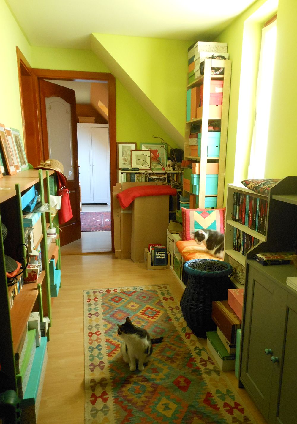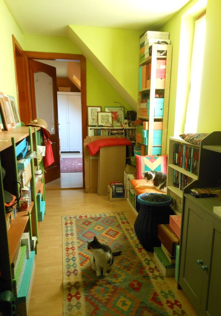 Az ott jobbra egy ablakba ülős macskahely. Elvileg olvasóhely is lehetne, de hát, ugye, macskák.