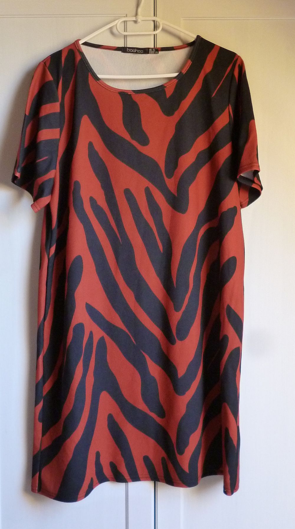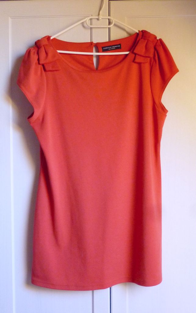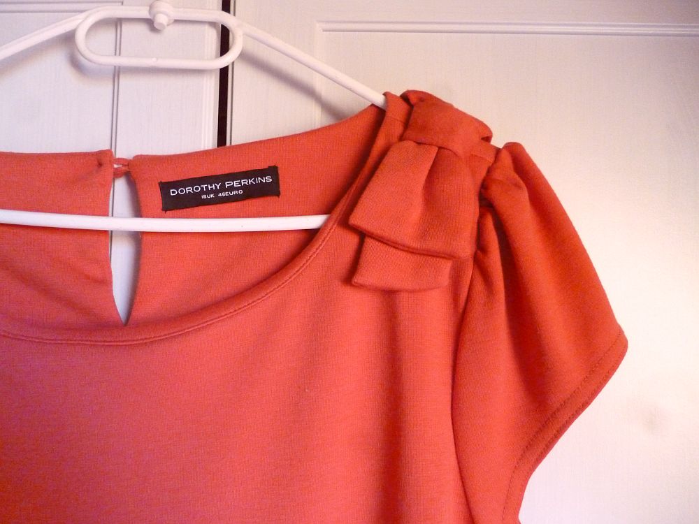 Item, 18-as méretű fura korallszín izé, vagy ruha, vagy tunika, valószínűleg jól átalakítom őtet. A márkája Dorothy Perkins (ez az én kilencvenes évek turkálóin szocializálódott lényem számára évekig kitartó minőséget jelent), a színe remek, a szabása röhejes, az anyaga viszont csuda finom, simogató trikotázs, szóval nem tudtam otthagyni.