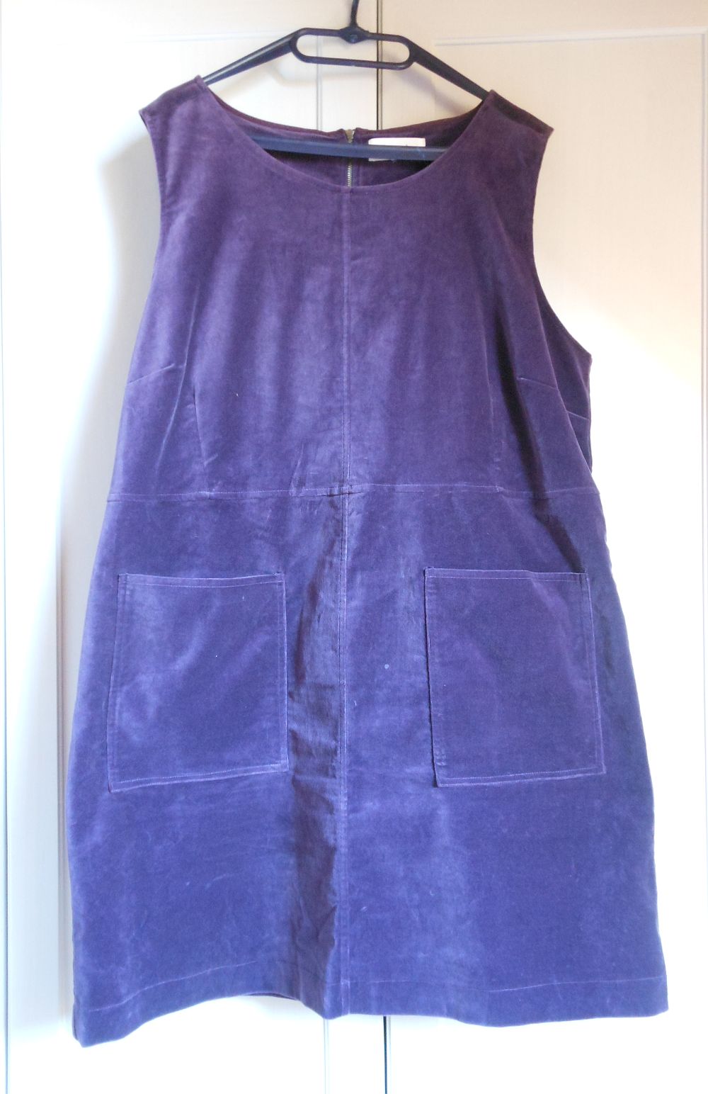 Sajnálkozva ugyan, de nem jósolok hosszú jövőt a lila kötényruhának a szekrényemben. Nyakban meg vállban csúnyán eláll, minden irányból bő, és mivel béleletlen, idegesítő módon hozzáragad a harisnyámhoz. Nem azért hordok ruhákat, hogy állandóan húzkodjam őket, grr.