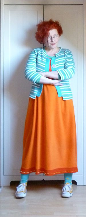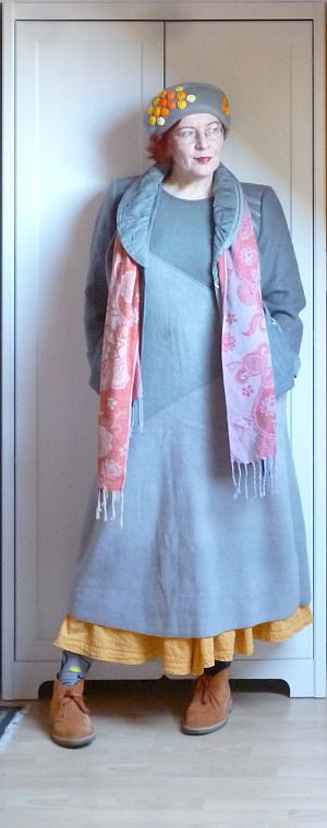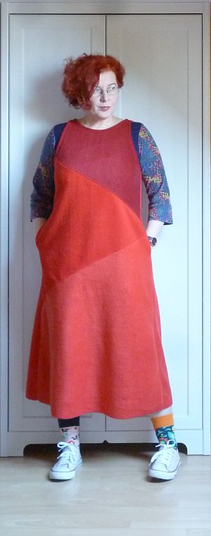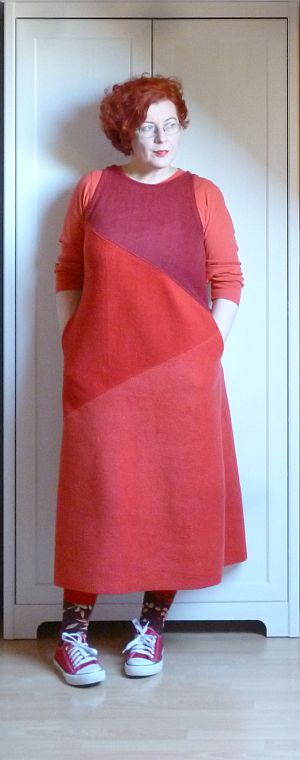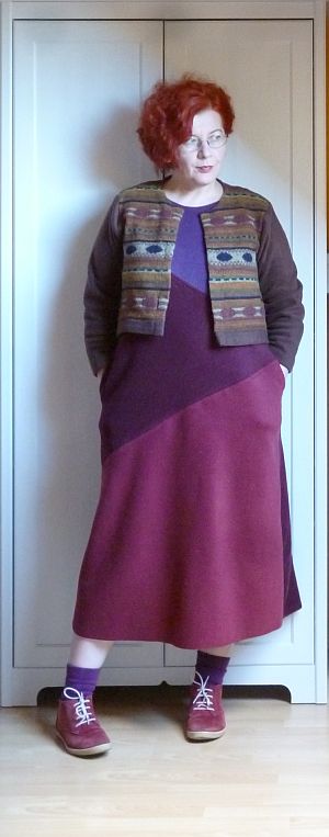Sajnálkozva ugyan, de nem jósolok hosszú jövőt a lila kötényruhának a szekrényemben. Nyakban meg vállban csúnyán eláll, minden irányból bő, és mivel béleletlen, idegesítő módon hozzáragad a harisnyámhoz. Nem azért hordok ruhákat, hogy állandóan húzkodjam őket, grr.