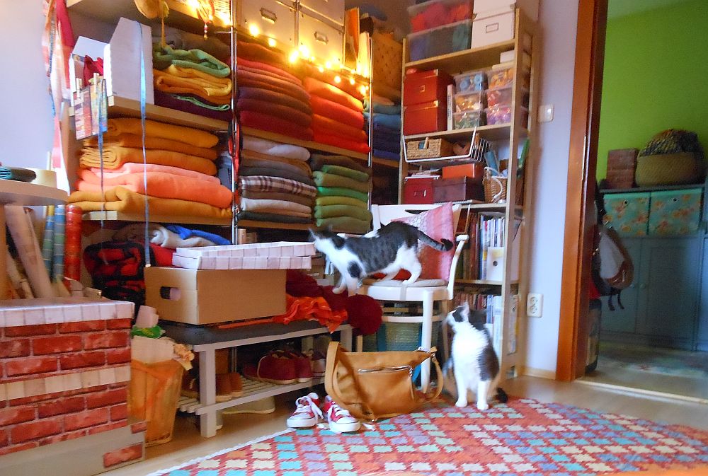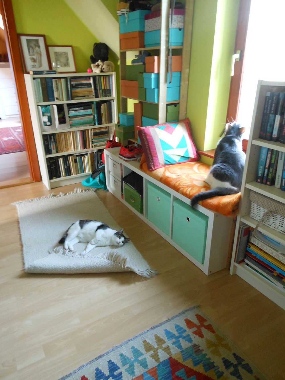 A “háromba vágtad, édes jó Lajosom?”-nál még nem tartunk, de már rettenetes mennyiségű dobozt hajtogattam össze és/vagy láttam el öntapadós tapétával és festékkel. Mindeközben persze két kézzel táplálom az entrópiát, a macskák legnagyobb örömére.