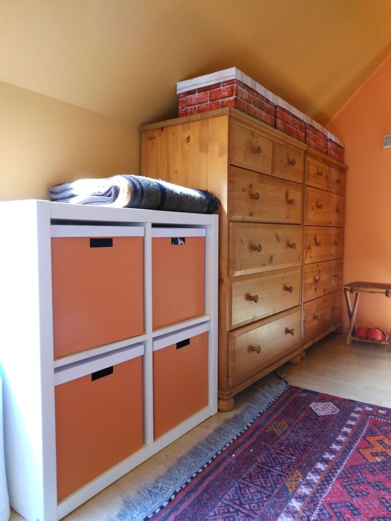 Fedje a feledés kegyes fátyla, hogyan nézett ki eddig a hálószoba ajtaja melletti rész – káosz volt ott és tohuvabohu, de nagyon. Mostanra viszont végre bevontam-lefestettem a dobozaimat, úgyhogy ideje megmutatni őket.